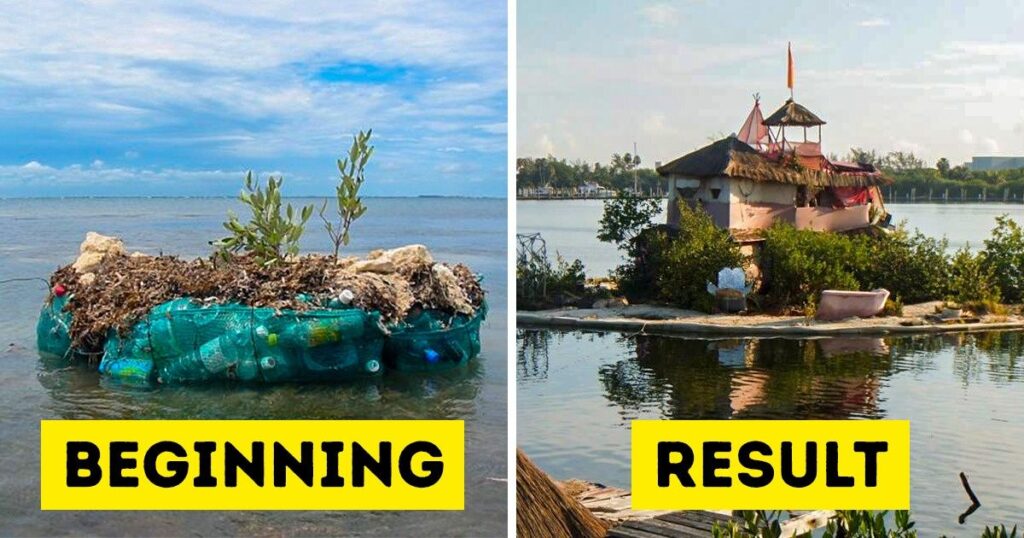 The island’s core structure consists of approximately 100,000 plastic bottles, tightly bound together and enveloped in protective fruit bags to enhance durability. This ingenious use of repurposed materials not only demonstrates the vast potential for recycling but also serves as a beacon of environmental consciousness. Accompanying the plastic bottle foundation are wooden pallets, skillfully incorporated to provide stability and additional living space.