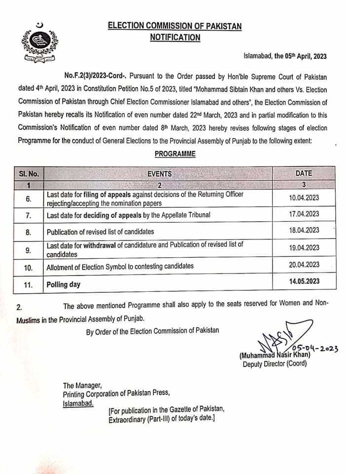 ISLAMABAD: The Election Commission of Pakistan (ECP) on Wednesday issued a new schedule for the Punjab elections, which will take place on May 14.