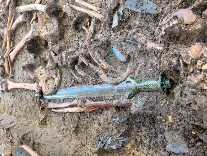 The sword was found within a burial site containing the remains of a man, a woman, and a child. Further investigation is needed to determine the relationship between the individuals, as it remains unclear whether they were related or what their connections might have been. The discovery of this intact burial site provides a valuable opportunity to unravel the social and cultural aspects of Bronze Age communities in the region.