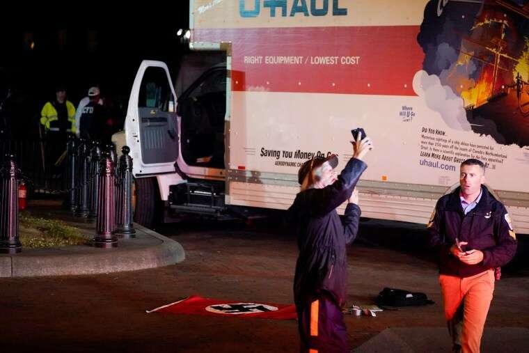 According to reports, investigators discovered a Nazi swastika flag inside the truck that crashed at Lafayette Square. Following the crash, law enforcement officers carefully collected the flag and other potential evidence, placing them in plastic evidence bags before securing them in the back of the U-Haul truck.