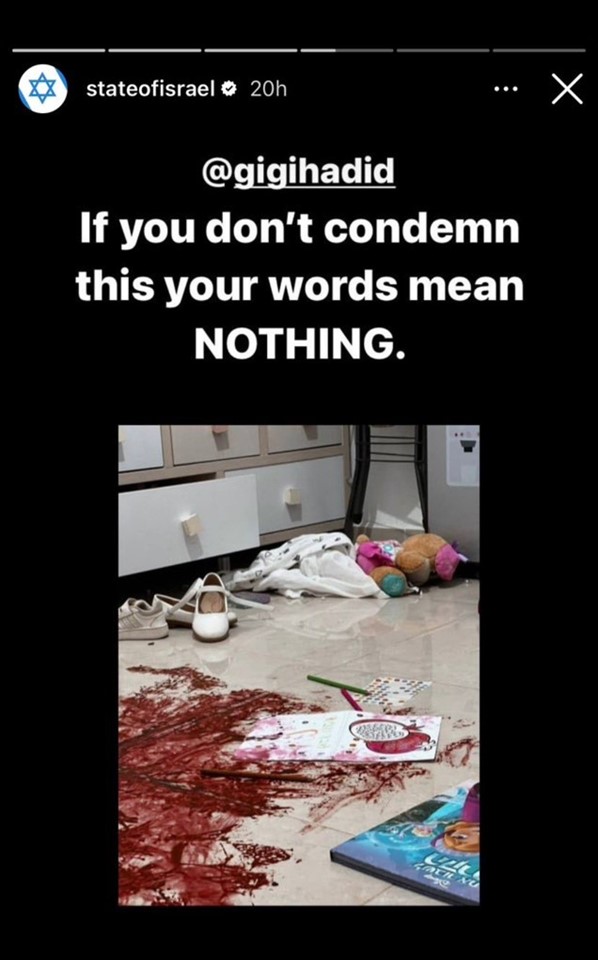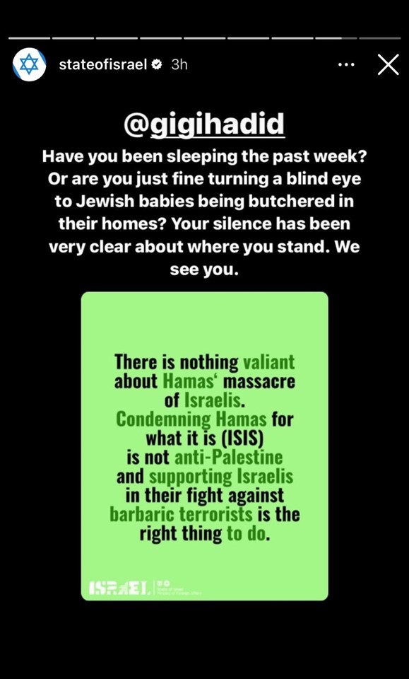 The Israeli government retaliated by tagging Gigi in a string of pictures from their official Instagram account, asking, “Have you been sleeping the past week?”