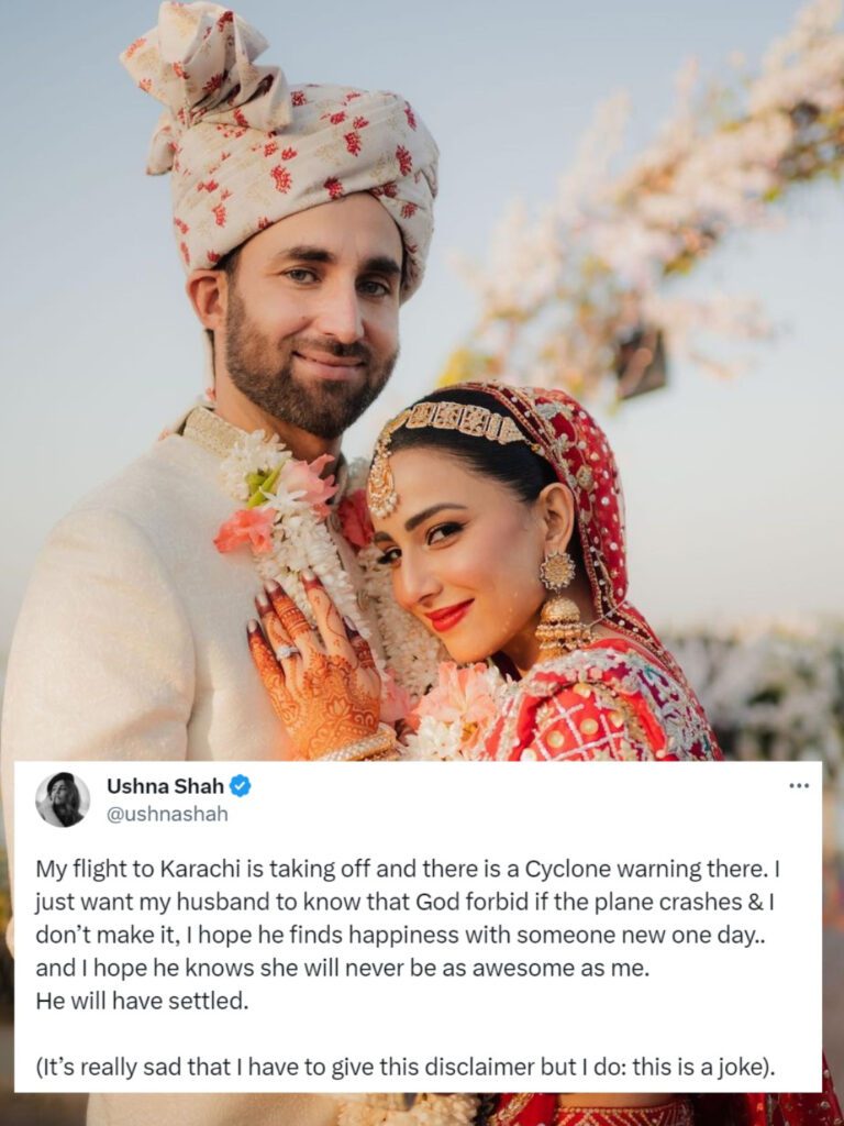Ushna Shah, known for her witty remarks and blunt sense of humor, tweeted just before her flight departure, “My flight to Karachi is taking off, and there is a Cyclone warning there. I just want my husband to know that God forbid if the plane crashes & I don’t make it, I hope he finds happiness with someone new one day… and I hope he knows she will never be as awesome as me. He will have settled.” The tweet quickly caught the attention of social media users, who expressed concern and confusion over her remarks.