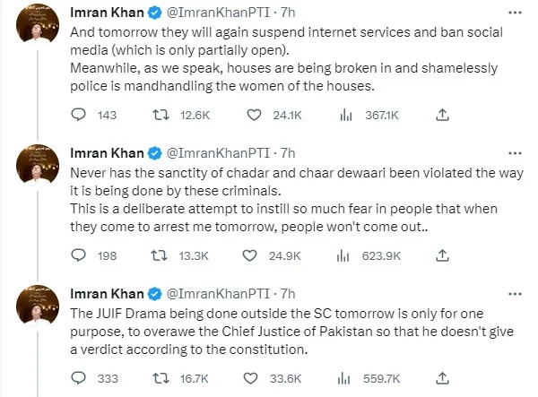 Imran Khan accused the government of violating basic human rights and claimed that the authorities are using violence and fear to silence the opposition. He also alleged that the ruling coalition will once again suspend internet services and ban social media today to prevent any public relations.
