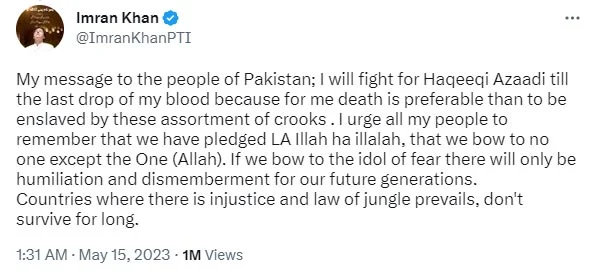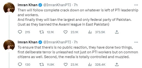 The former prime minister Imran Khan claimed that the government plans to ban the PTI, just as they banned the Awami League in East Pakistan. He warned that if the people of Pakistan bow to the idol of fear, there will only be humiliation and dismemberment for future generations. Countries, where injustice and the law of the jungle prevail, do not survive for long.
