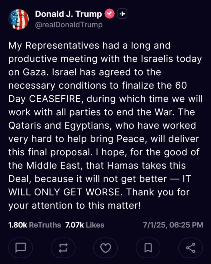- President Trump’s Message: Trump tweeted from Truth Social, calling the ceasefire “the final proposal” and warning Hamas the situation would “only get worse” if they reject it .