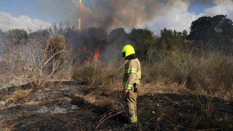 Videos circulating online showed firefighters extinguishing a brush fire near Lod and damage, including broken glass, at a train station in Modin. Both locations are southeast of Tel Aviv, Israel’s main commercial city.