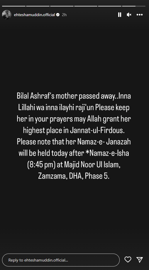 The news about his mother’s passing was shared by well-known Pakistani director and actor Ehteshamuddin. He used Instagram to share this sad update. Ehteshamuddin’s post conveyed his sorrow, saying, “Bilal Ashraf’s mother has passed away. Inna Lillahi Wa Inna Ilayhi Raji’un.” He requested everyone to remember her in their prayers and wished that Allah bestows upon her the highest place in Jannat-ul-Firdous. He also informed that the funeral prayer, known as Namaz-e-Janazah, would be held on the same day after the Namaz-e-Isha (8:45 pm) at Majid Noor Ul Islam, Zamzama, DHA, Phase 5.