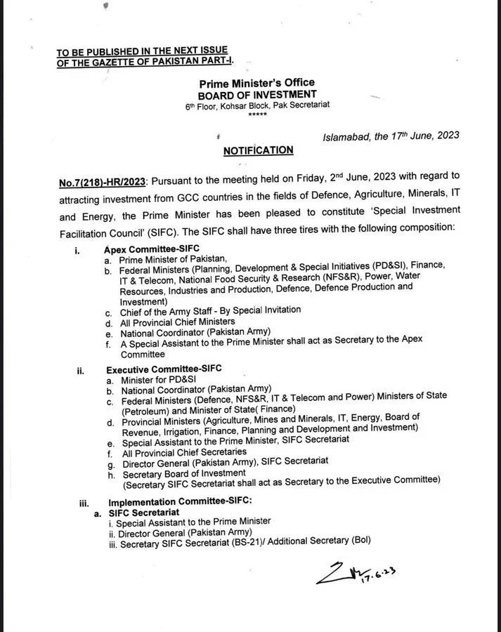 ISLAMABAD: In a move to boost the government’s efforts for economic revival, the federal government has established the ‘Special Investment Facilitation Council (SIFC)’ with Prime Minister Shehbaz Sharif as its chairperson. The council, aimed at attracting investments from GCC countries in various sectors such as defence, agriculture, minerals, IT, and energy, will also include the army chief and senior federal minister, as per the notification issued by the PM Office.