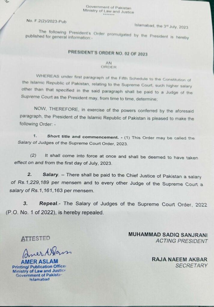 In a significant development, Acting President and Senate Chairman Sadiq Sanjrani issued an order on July 3, amending the monthly salaries of the Chief Justice of Pakistan (CJP) and other Supreme Court judges. The order, titled the “Salary of Judges of the Supreme Court Order 2023,” stipulates that the CJP will now receive a monthly salary of Rs1.2 million, while other top court judges will receive Rs1.1 million per month. The changes take immediate effect and are retroactively deemed to have been in effect from the beginning of the current month.