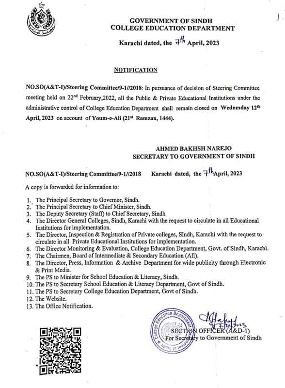 The notification reads, “In pursuance of decision of Steering Committee meeting held on February 22, 2022, all the public and private educational institutes under the administrative control of College Education Department shall remain closed on Wednesday April 12, 2022 on account of Youm-e-Ali (21st Ramzan, 1444).”