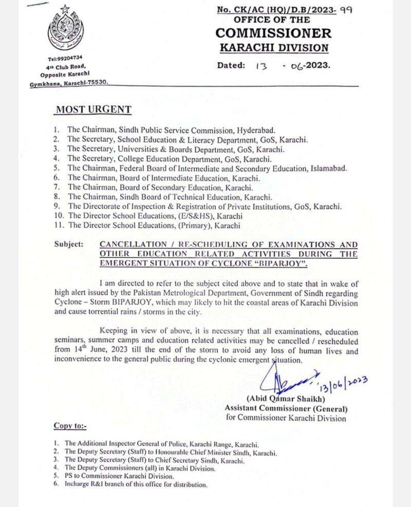 Karachi’s Assistant Commissioner, Abid Qamar Shaikh, issued a notification on behalf of the Sindh government, mandating the cancellation or rescheduling of all examinations, education seminars, summer camps, and education-related activities from June 14, 2023, until the storm has passed. This measure aims to safeguard human lives and prevent inconvenience to the general public.