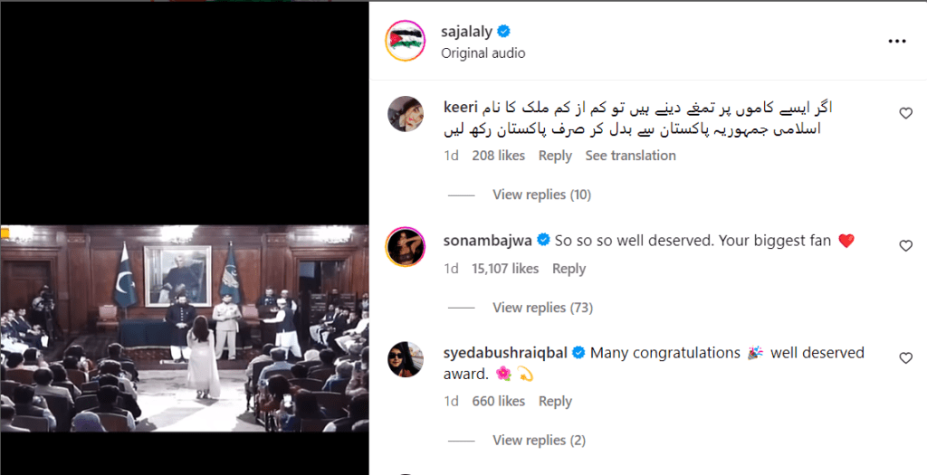In her post’s caption, Sajal expressed her gratitude to the Almighty for receiving the prestigious award. She thanked her family and fans, saying, “I received this honor because of my mother’s prayers.”