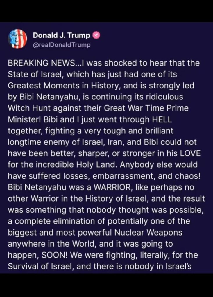Donald Trump has made an unprecedented call for Israel to cancel Prime Minister Benjamin Netanyahu’s ongoing corruption trial or issue him a pardon, calling the proceedings a politically motivated “witch hunt.” In a Truth Social post on June 25, Trump said: “Bibi Netanyahu’s trial should be CANCELLED, IMMEDIATELY, or a Pardon given to a Great Hero…”.