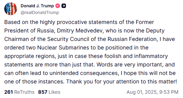In the broader picture, this Trump vs. Putin nuclear standoff also highlights the changing role of digital diplomacy. World leaders are now issuing threats, deploying military assets, and responding to provocation through platforms like X (formerly Twitter) and Truth Social, replacing traditional backchannel diplomacy with posts and press releases.