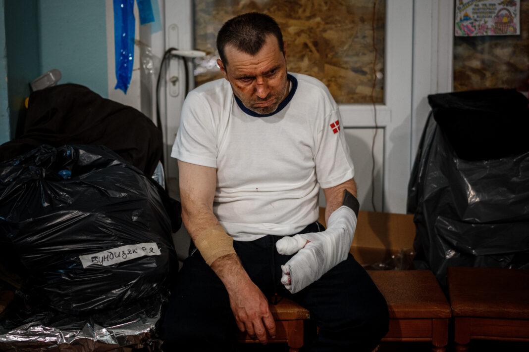 The soldiers look exhausted. Some were injured in the morning or during the day but are only moved to the first aid facility at night since Russian forces regularly shell the roads during the day.